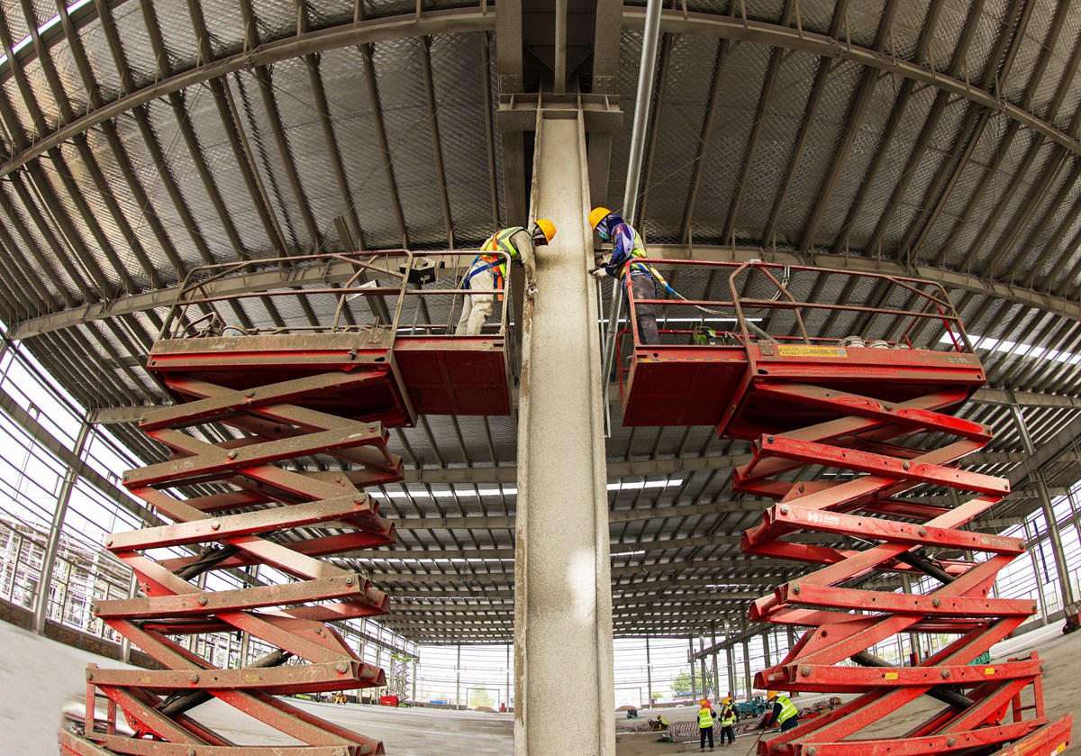 5月11日,工人借助升降车对广聚物流园区厂房钢结构进行防火涂层施工