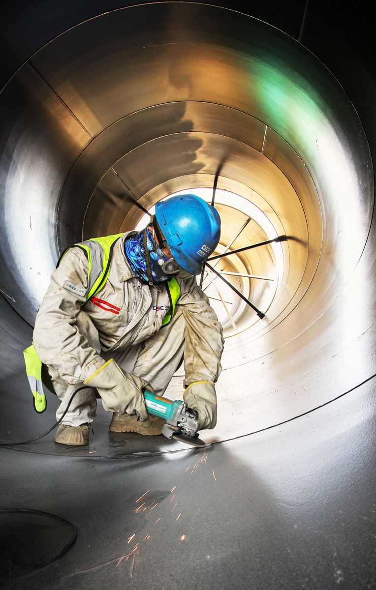 5月13日,在聚能发电公司施工现场,工人对循环水管焊缝进行抛光处理