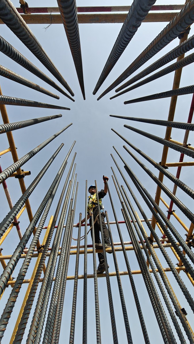 5月13日,工人在聚能发电公司机组项目建设现场绑扎钢筋
