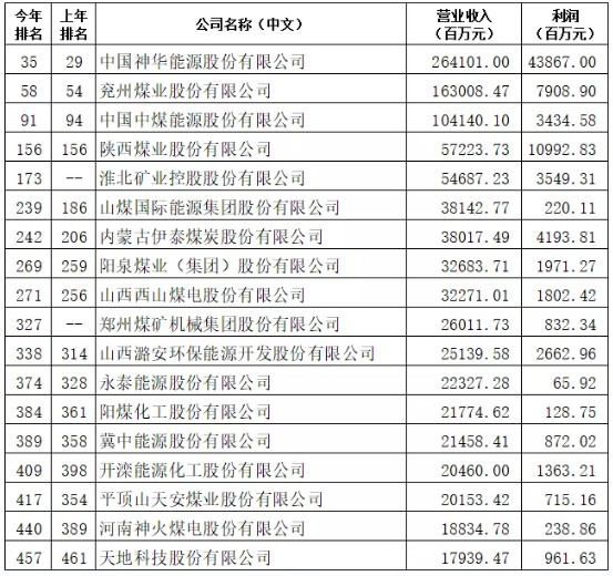 2019年7月10日,财产中文网宣布了最新的《财产》中国500强排行榜。煤炭行业有18家公司入围,划分为:
