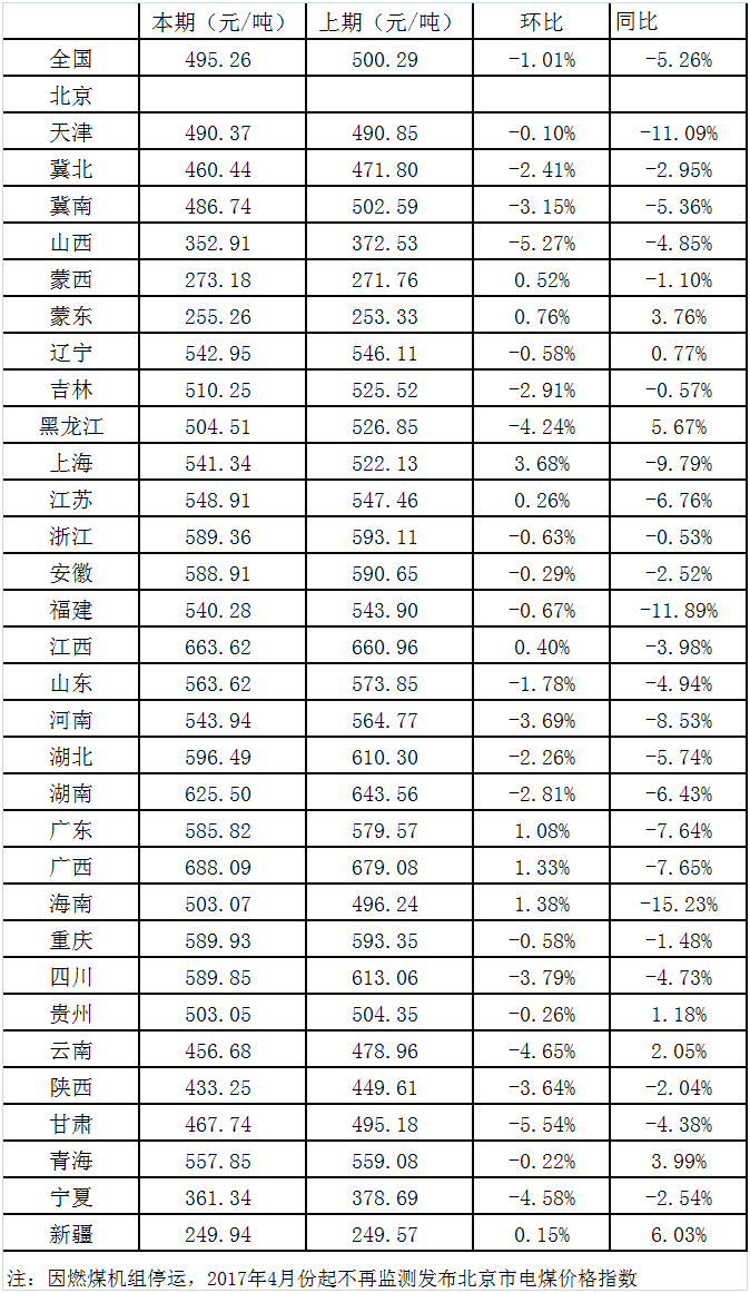2019年5月15日,国家生长革新委价格监测中心宣布4月中国电煤价格指数为495.26元/吨,环比下行1.01%,同比下降5.26%。其中,监测的31个省市(不含北京市)中,价格下行地区数量有22个,下行幅度减弱至27.44元/吨以内;其他9个地区电煤价格全部上行,涨幅上行至19.21元/吨以内。本月全国煤炭价格运动规模整体上移,且煤炭价格上下行地区数量比例基本维持,说明价格下行区域活力减弱,而上行幅度扩大。